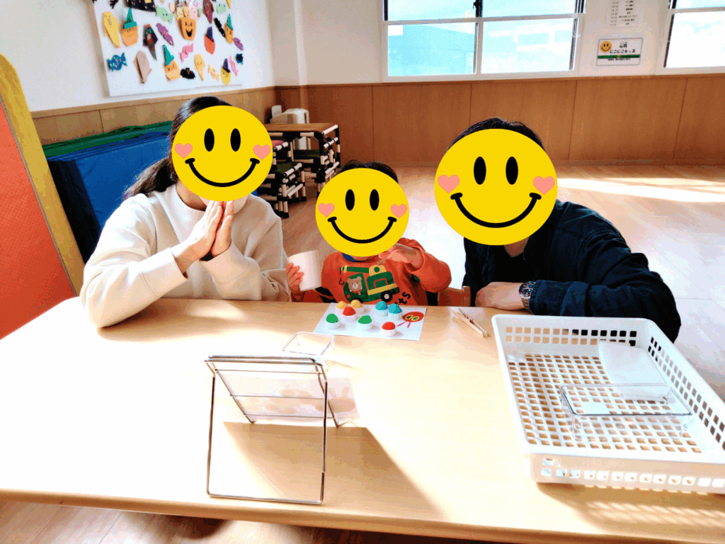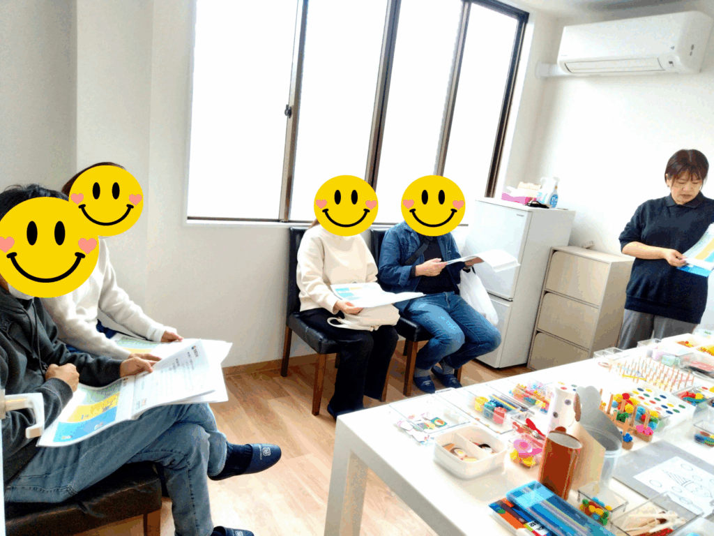普段療育時間に使用している療育グッツの紹介や活動内容の説明、利用するための手続き等についてお話をさせて頂きました。